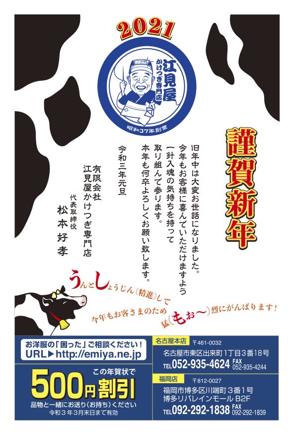 この調子で一期団結して今年もトッププロとしてより良い仕事をしていきます! 添付している年賀状に割引券がついていますのでご利用ください 今年も何卒宜しくお願い申し上げます