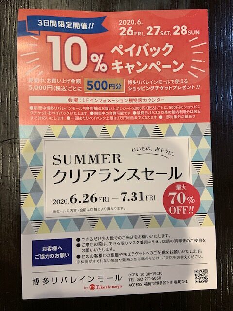 さて、今回緊急告知としたのは博多リバレインモールにて26、27、28の3日間10%のペイバックキャンペーンがあります。5000円ごとに500円のショッピングチケットがもらえます。