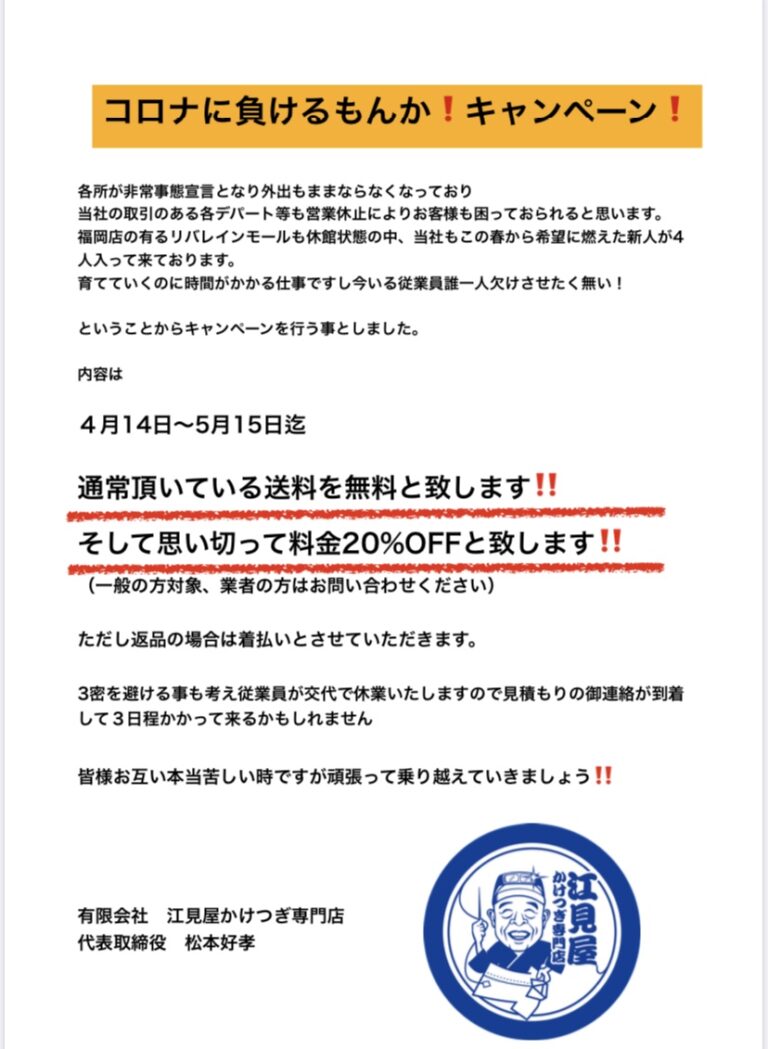 皆さんも外出が中々できない中かけつぎを出したいけどと思う方も多いと思います。 当社も東京始め各所のデパートとかも取引がありそこが休館となって厳しいものがあります。福岡支店もリバレインが休館となり中で寂しく作業したりしてます。