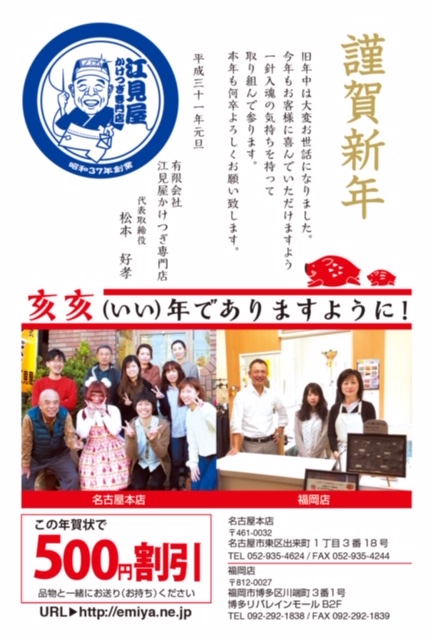 明けましておめでとうございます 昨年は福岡店も無事1周年を迎える事も出来、九州の業者さんからの依頼も 増えて来ました 今年も皆様のお力になれるように社員一同「一針入魂」の気持ちを持って 取り組んで参りますので何卒よろしくお願い申し上げます