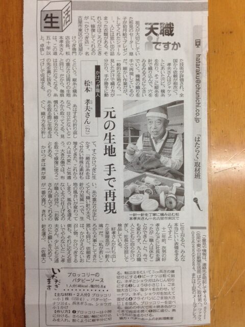 今日は寒いですね。週末寒くなるそうなので皆様体調には気をつけてくださいね。 今朝の中日新聞の[天職ですか]というコーナーで弊社の会長が取り上げていただいたので是非ご覧下さい。