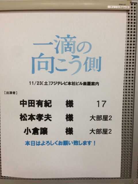 先週土曜日に東京のフジテレビに会長と行ってきました。 BSフジの毎週土曜日夜10時から放送している『一滴の向こう側』 という番組のスタジオ収録です。 初めてスタジオに入ったのですが(いやよく考えたら小学校の時姉が天才クイズという番組に出た時に行った事があるかな) 多くのスタッフさんがいて番組作りも大変だなぁと思いました。