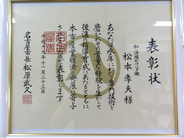 創業者 松本孝夫が名古屋市技能功労者として表彰されました